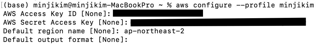 나는 프로필을 만들고 해당 프로필로 전환했지만, 프로필을 사용하지 않는다면 그냥 aws configure만 쳐서 설정해주면 된다.