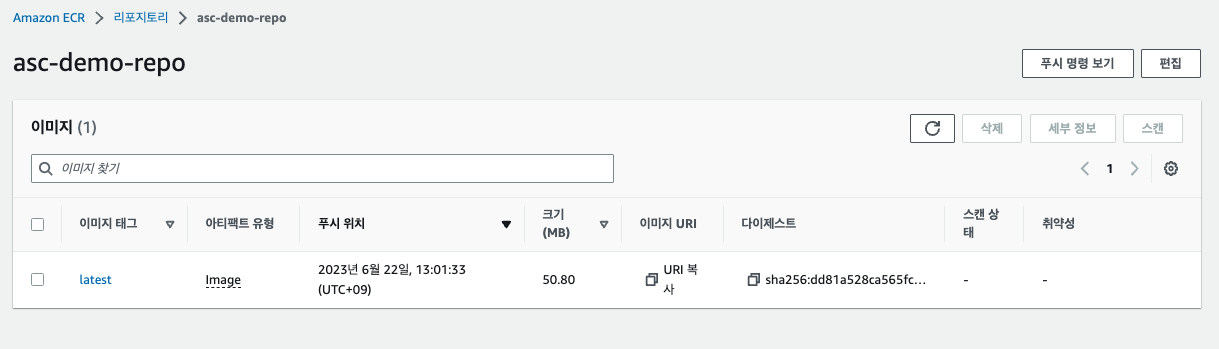 ECR 레포에 가보면 이렇게 이미지가 올라간 걸 확인할 수 있다.