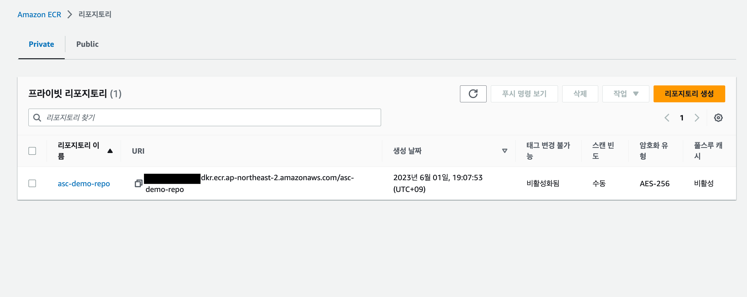 Elastic Container Registry에 들어가서 리포지토리 생성을 해준다.